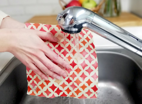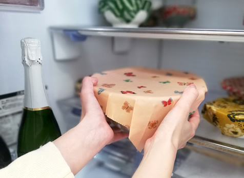 低温環境で蜜蝋が固くなり形をキープできます。いつもの残ったおかずは繰り返し使えるエシカルラップをかけて冷蔵庫でエコ保存。