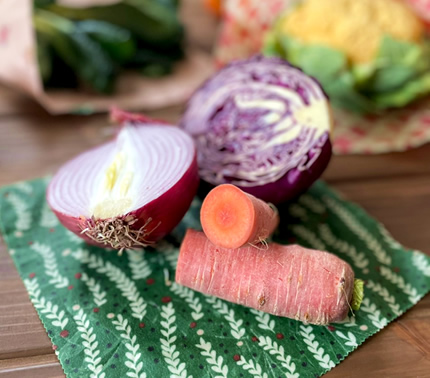 切って残った人参などのカット野菜もエシカルラップでぴったりフィットし、レタスやホウレン草などの葉野菜もバラバラにならず野菜の鮮度も長持ち保存。
