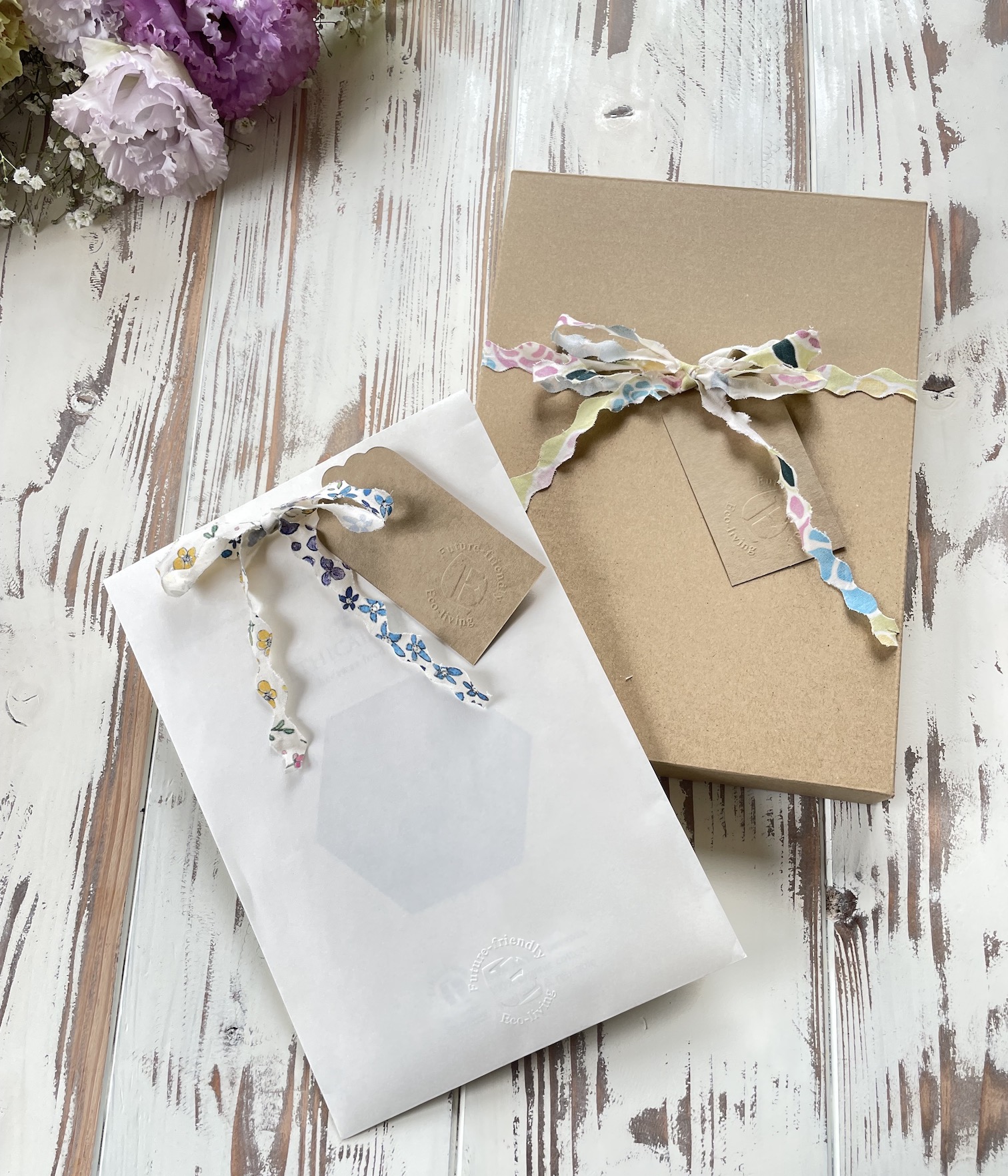 プレゼントラッピングも環境問題を考慮し、プラスチックフリーで過剰包装はいたしません。エシカルラップの残布をアップサイクルとしてリボンに使っています。(リボン柄はその時によって異なります)
